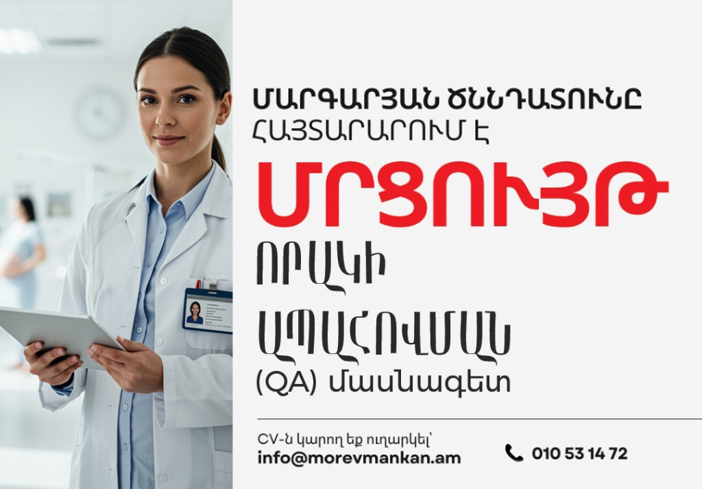Մարգարյան ծննդատունը հայտարարում է մրցույթ Որակի Ապահովման (QA) մասնագետի հաստիքի համար...։